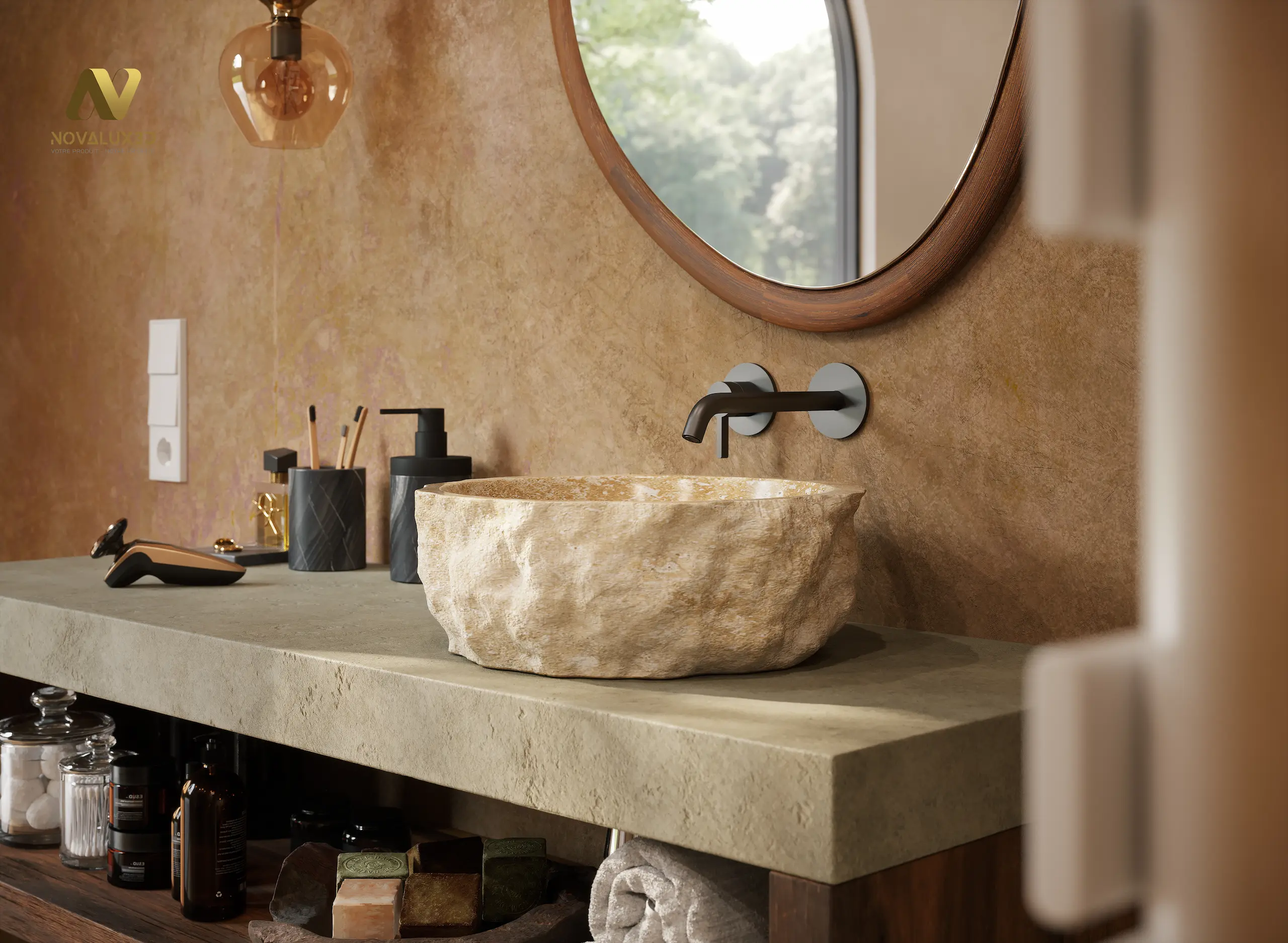 Zoom matière – vasque pierre & robinetterie : finitions, textures et lumière maîtrisées.